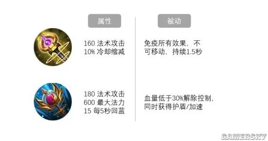 最大法力护盾:当英雄的生命值低于30%时,会获得一个护盾,该护盾可以吸收伤害,其数值受英雄的等级成长及法术攻击力加成,具体计算方式为500+英雄法术攻击力的5倍(也有说法为1.5倍),若英雄的法术攻击力为1000,则护盾值为500+1000×5=5500(或500+1000×1.5=2000),在护盾持续期间,英雄还会额外获得30%的移动速度加成。